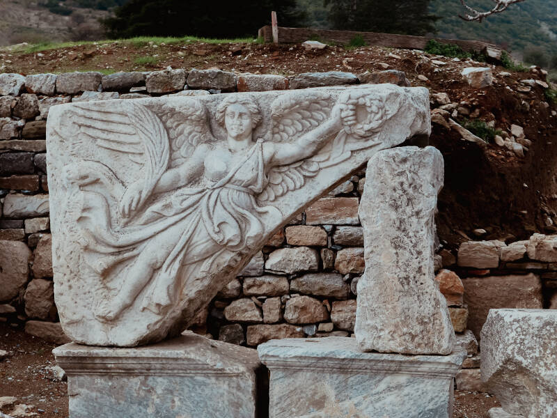 以弗所是《圣经新约:以弗所书》的出处、早期罗马总督设立的地方。遗址的各个角落散落着当时基督徒为躲避罗马帝国的迫害而使用的暗号。此符号也称“耶稣鱼”,因其历史意义而成为基督教会的代表符号之一。它看起来像是在“米”字外画一个圆形,是“ΙΧΘΥΣ”这5个希腊文字母重合在一起形成的。在希腊文中,I = 耶穌,X = 基督,θ = 神,Y = 子,ε = 救赎,这个符号的意思是"Jesus Christ, Son of God, Saviour"(耶穌基督、神之子、救世主),发音为“伊客提斯“(Ichthys,/ˈɪkθəs/,希腊文‘鱼’的发音)。