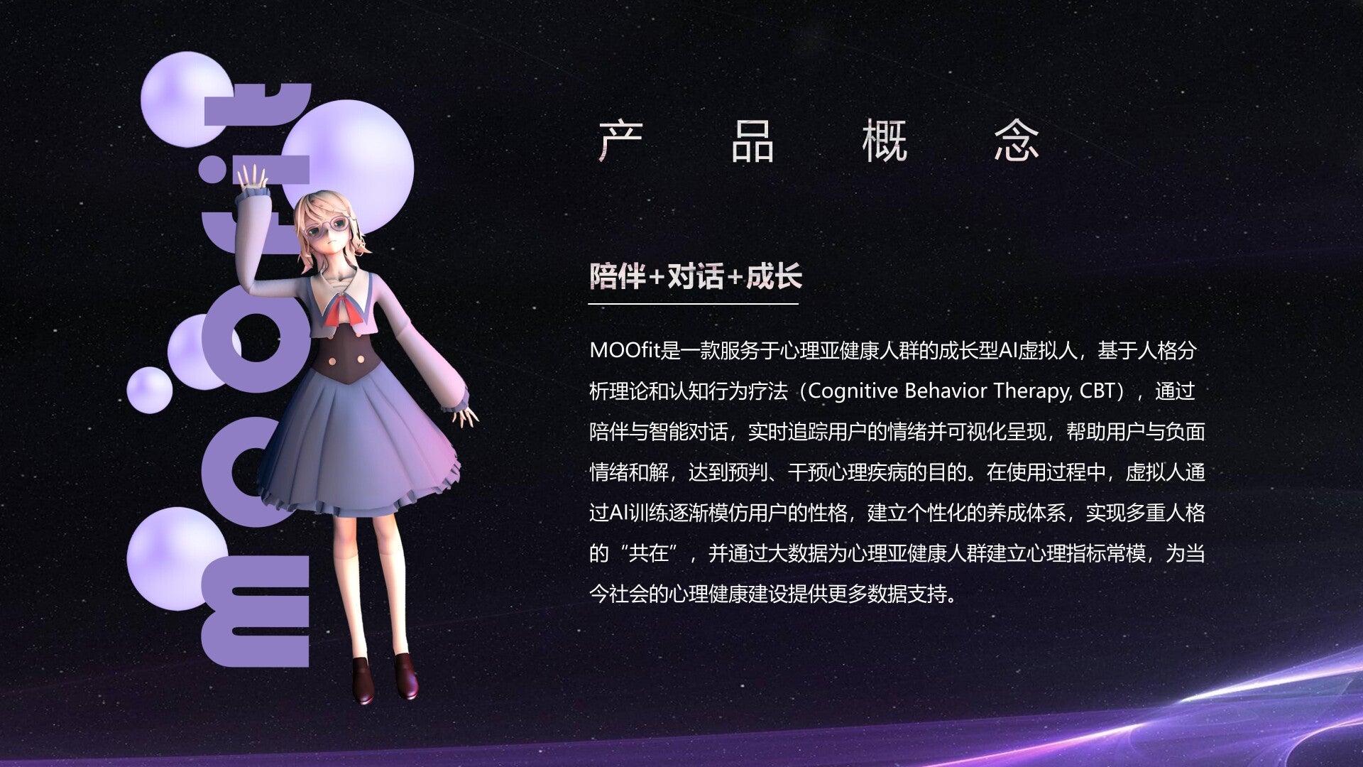 MOOfit 的名称来源于单词“mood”(情绪)和“fit”(健康)。这是一款服务于心理亚健康人群的成长型 AI 虚拟人,基于人格分析理论和认知行为疗法(Cognitive Behavior Therapy, CBT),通过陪伴与智能对话,实时追踪用户的情绪并可视化呈现,帮助用户与负面情绪和解,达到预判、干预心理疾病的目的。在使用过程中,虚拟人通过 AI 训练逐渐模仿用户的性格,建立个性化的养成体系,实现多重人格的“共在”,并通过大数据为心理亚健康人群建立心理指标常模,为当今社会的心理健康建设提供更多数据支持。